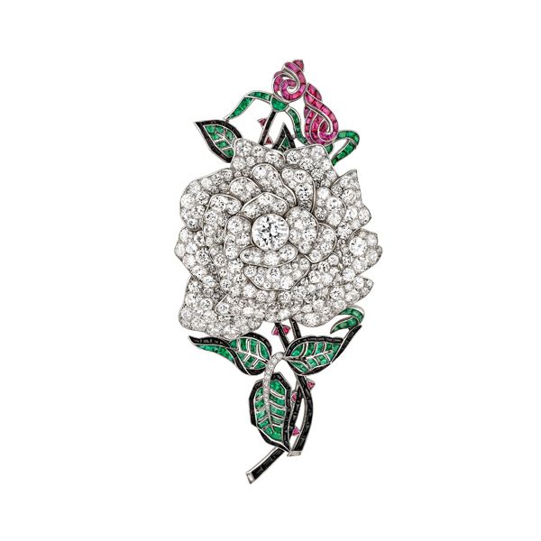 ローズ ブローチ 1925年 プラチナ、エメラルド、ルビー、オニキス、ダイヤモンド ヴァン クリーフ&アーペル コレクション © Van Cleef & Arpels