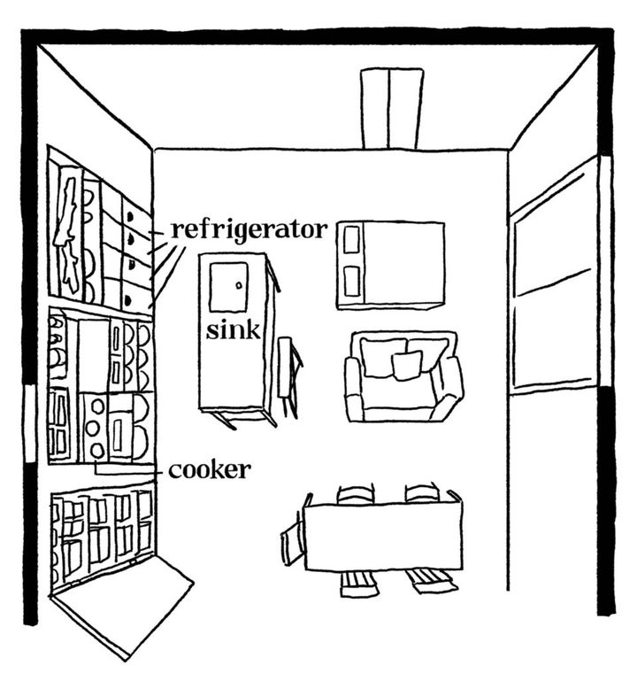 もともと窪みのあった空間に合わせて、オーダーメイドの食器棚や業務用冷蔵庫を収めた。息子が描いた絵やメッセージを飾り、大切な時を感じられるように。