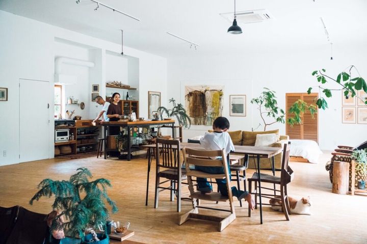 岡崎真悟さんとあかねさんが息子と愛猫3匹と暮らす一軒家は、元は卓球場だった建物を改装して作られたもの。ここから家族の新しい暮らしが始まった。倉庫のような115㎡のつくりや広さを生かそうと、土間と部屋の壁を取り払ったのだという。台所、リビングダイニング、ベッドルームがひと間続きの空間は、天井高で開放的な気分にさせる。