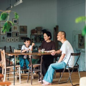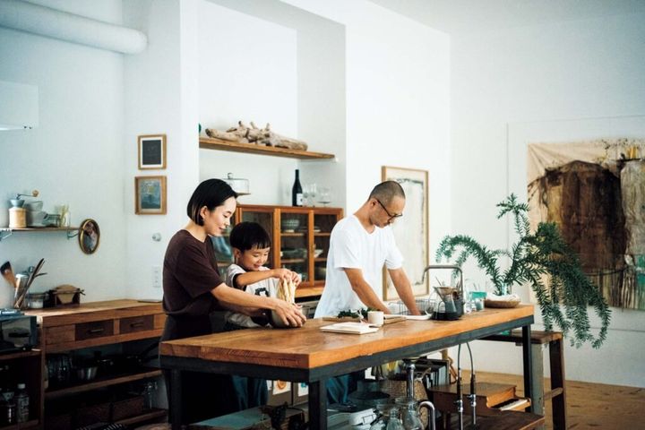 山、川、畑がある大分の自然豊かな環境で暮らす岡崎真悟さん、あかねさん、むぎくん。卓球場を改装した一軒家の空間は、リビングと台所が一体になった心地よさがある。