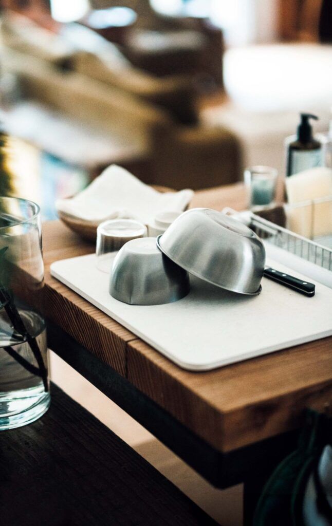 珪藻土の水切りマットに食器を置き、すばやく乾く工夫を。