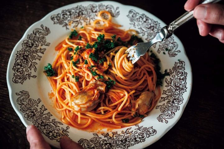 真悟さんがよく作る牡蠣のトマトパスタ。旅先で購入した思い出の器に盛り付けた。「料理を作っている時間は無心になれる。細かな下ごしらえも好きですね」