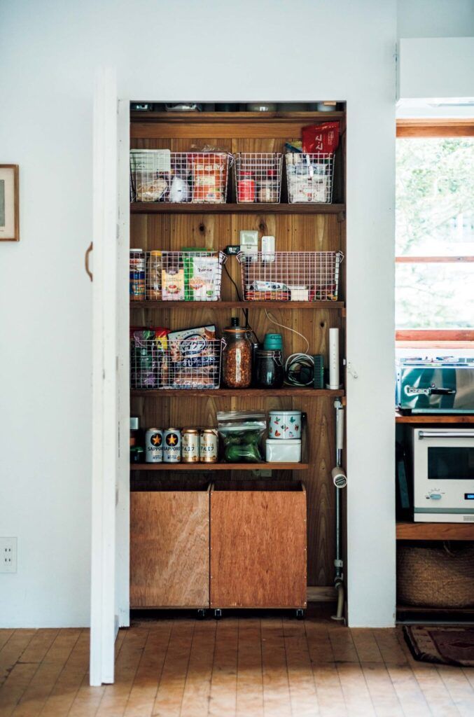 ガス台があるすぐそばに造作したパントリー。〈無印良品〉で購入したワイヤーバスケットに調味料、麺類、粉類などを分類してまとめた。