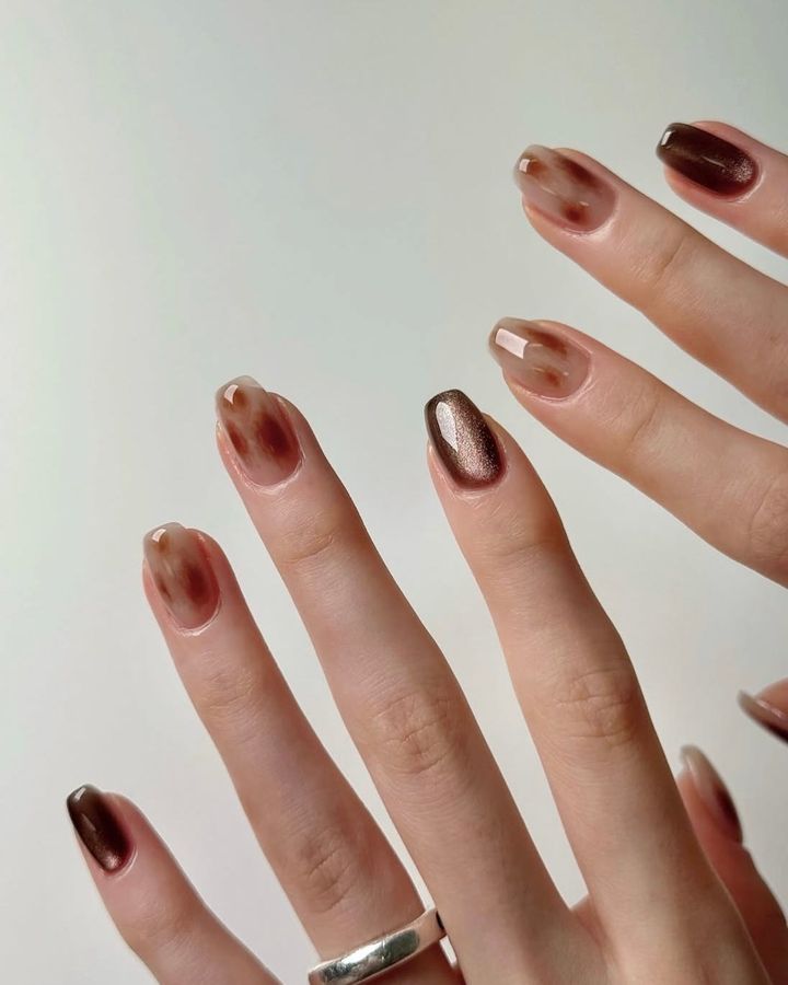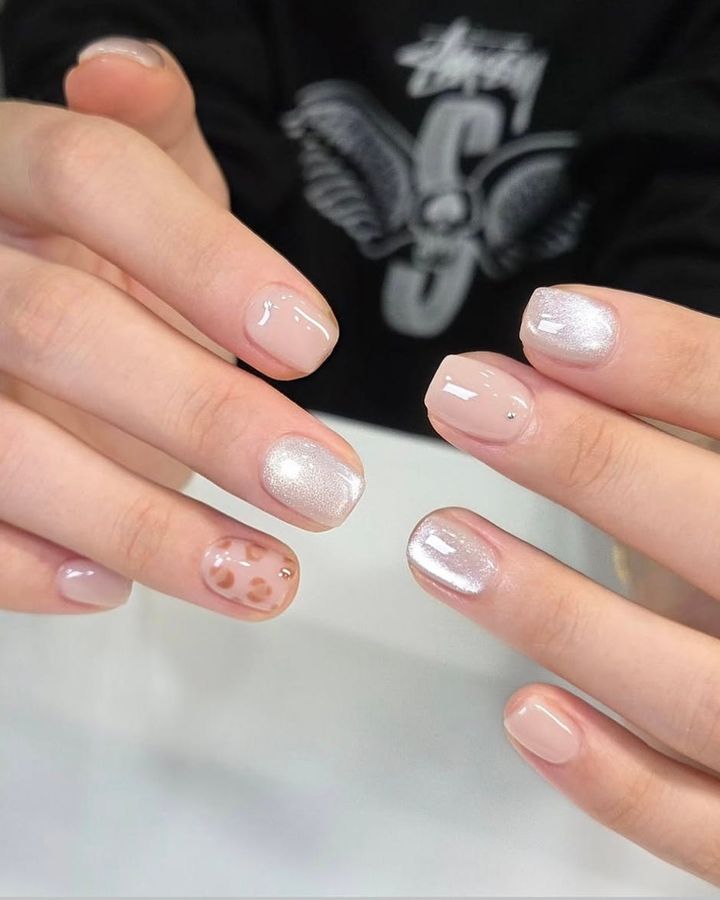 透明感のあるマグネットネイルにグレイッシュなアニマル柄をのせた、個性的かつ気品のあるルック。