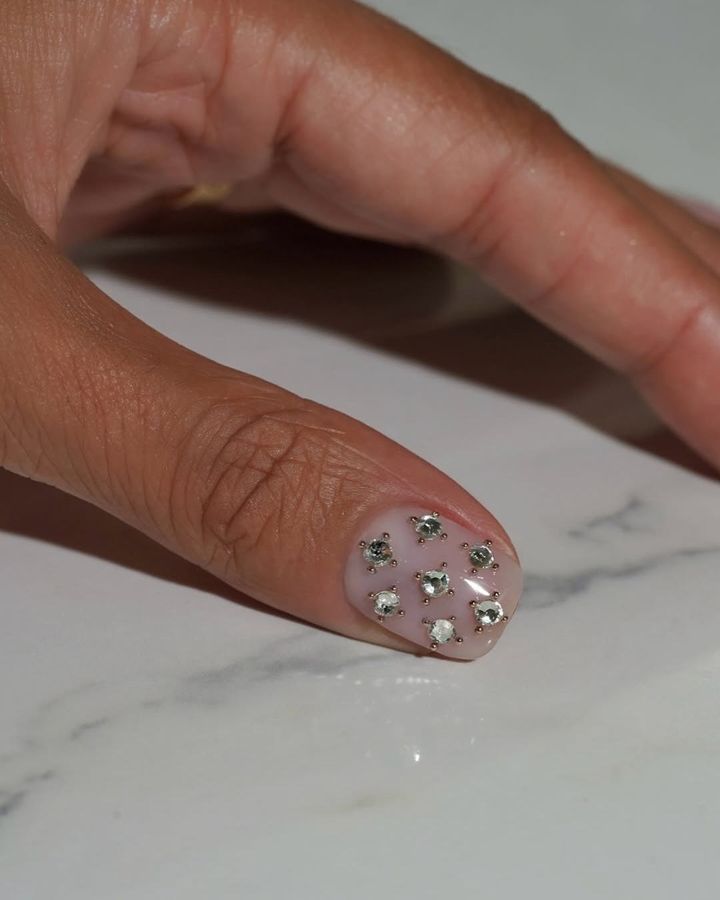 ヌーディに仕上げたチークネイルにストーンをプラス。