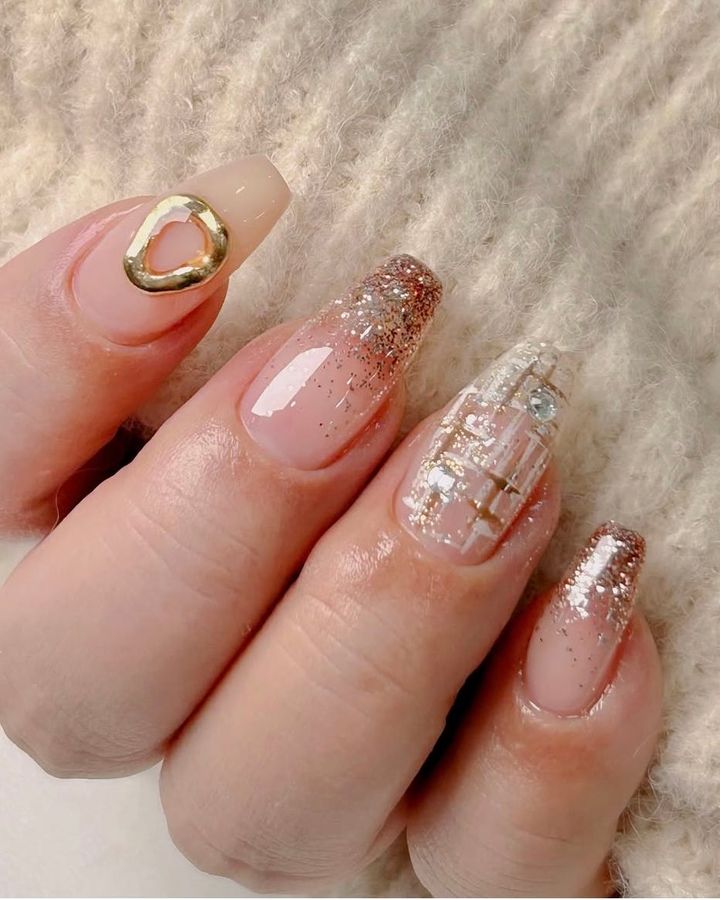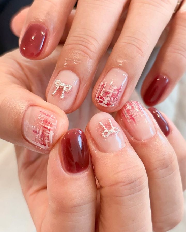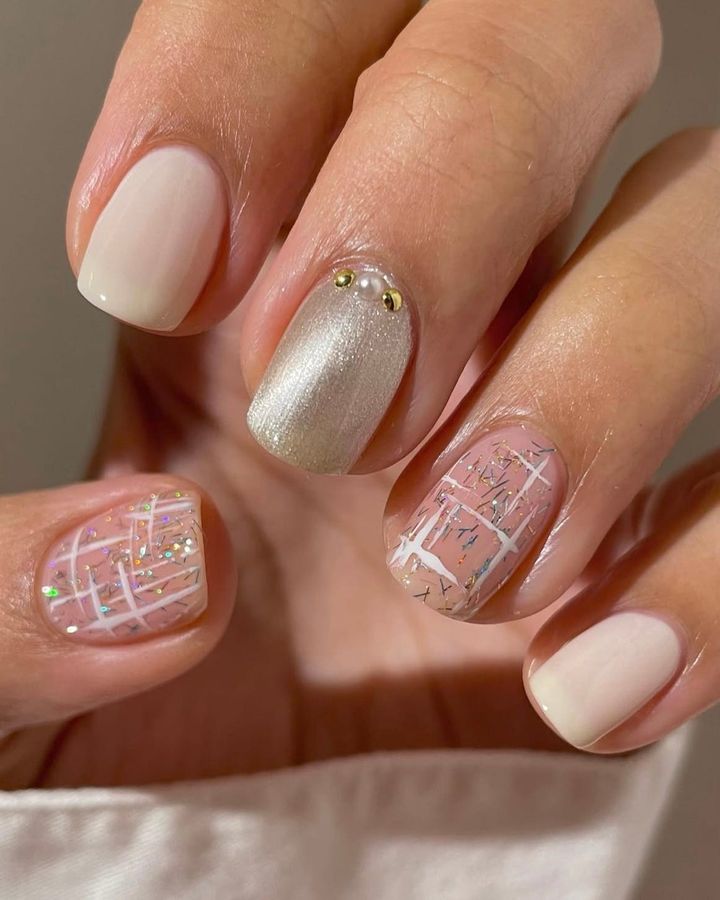 フェスティブなシーズンにぴったりなキラキラニュアンスあふれるデザイン。指ごとにデザインが違うところもおしゃれ。