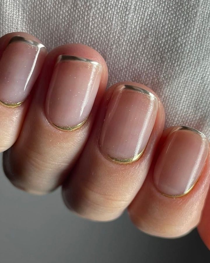 上下でシルバーとゴールドを使った、マイクロスキニーフレンチと逆フレンチの組み合わせ。どちらもラインが細いところが垢抜けポイント。