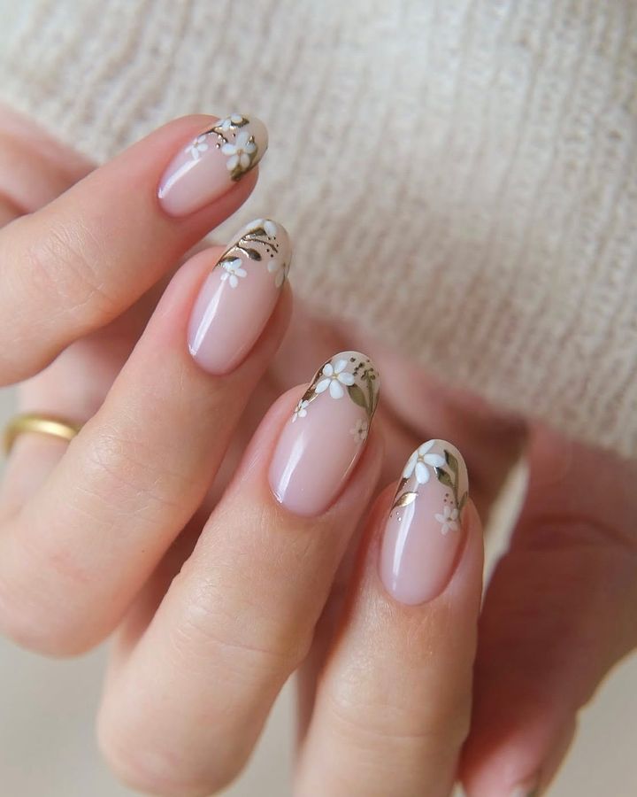 上から重ねたホワイトフラワーは、爪の輪郭周りにのせ、中央は空けるのが抜け感を出す秘訣。
