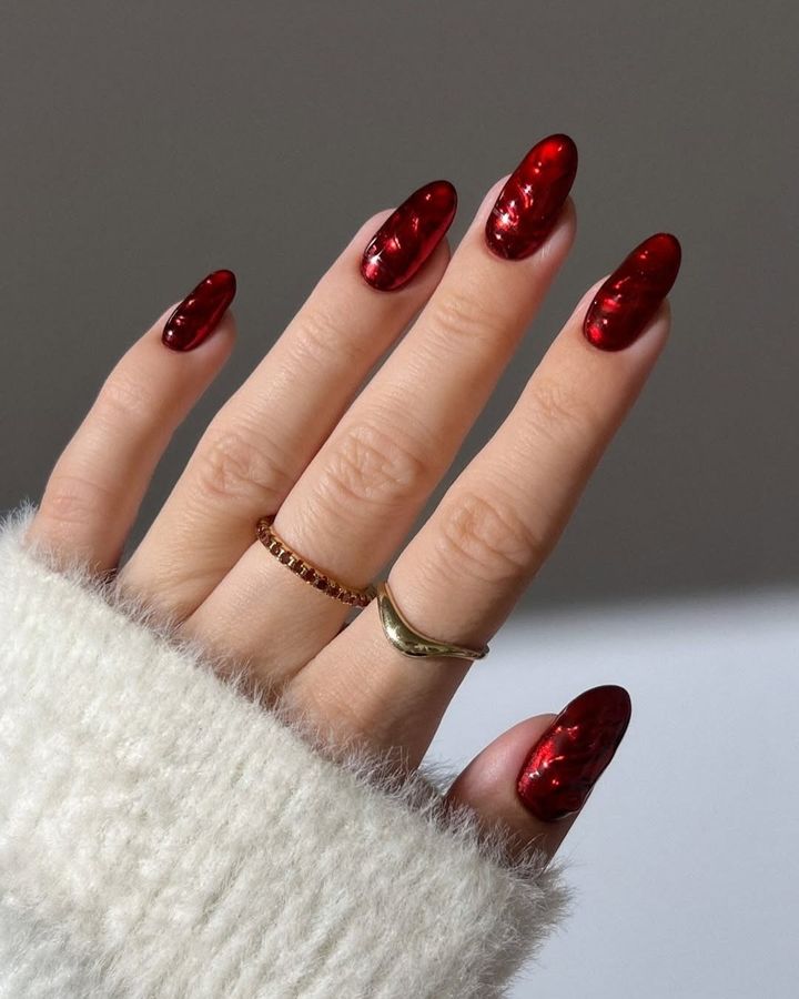 パーティにもおすすめの赤ネイルも、透明感のあるものを選ぶだけで、ぐっと洗練された印象に。