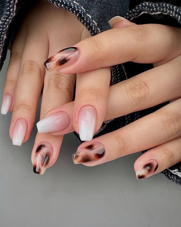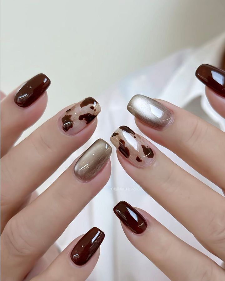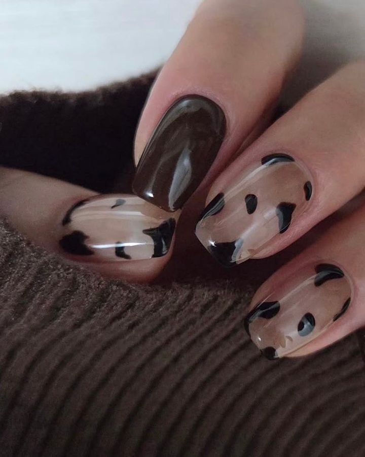 ダークブラウンとカウ柄の組み合わせが今っぽい。マーブルを仕込んだベースも巧み。