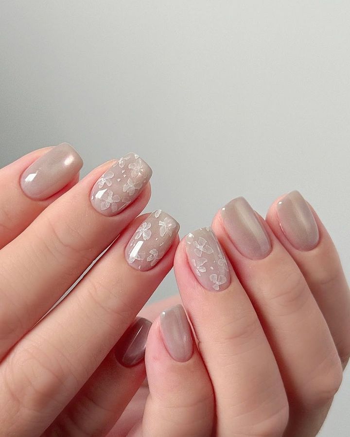 落ち着いた大人のヌードベージュ。透け感ホワイトの花柄のアクセントが清楚で素敵。