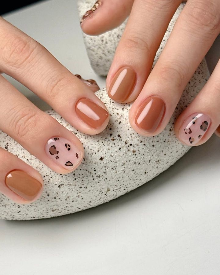 明るいキャメルトーンとモカ色のレオパード柄で、ナチュラルな雰囲気に着地。