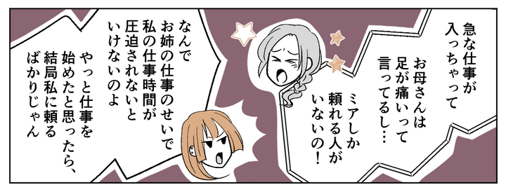 姉は「急な仕事が入っちゃって」と言いますが、私だって急ぎの仕事があります。仕事を始めたのはいいけど、結局私に頼ってばかりの姉に腹が立ちます。