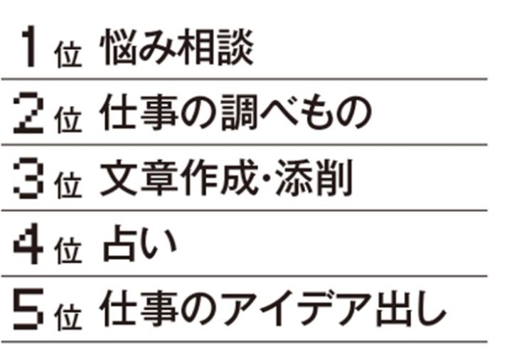 圧倒的に多かったのが悩み相談。仕事でも私生活においても、気軽に打ち明けられるのが魅力出そう。仕事だけではなく占いなど娯楽として楽しんでいる人も多くみられます。