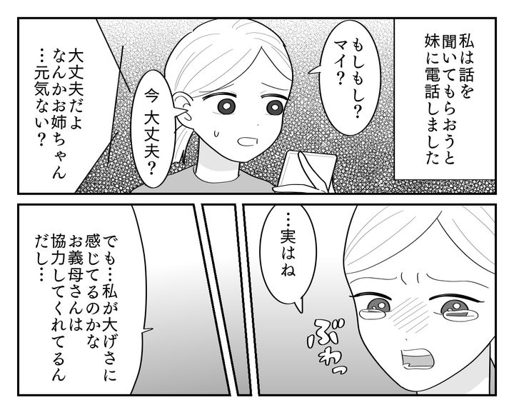 マイの優しい声を聞くなり、泣き出してしまった私。自分でも、そこまで追い詰められていたんだなと、あらためて実感しました。義母の態度や私への口出し、夫に相談しても我慢しろと言われたこと……。話しているうち「離婚」の言葉も口から出ました。