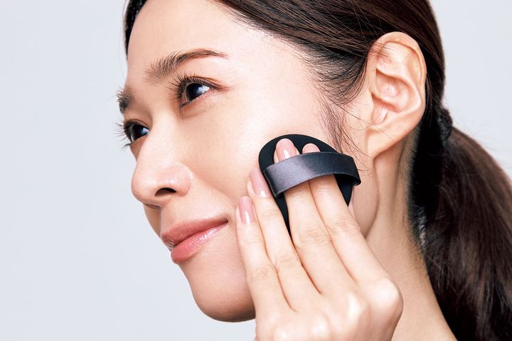 目の下の▽ゾーンから隠したい部分に円を描くように塗布。フェイスラインはパフに残ったファンデを薄く広げる。