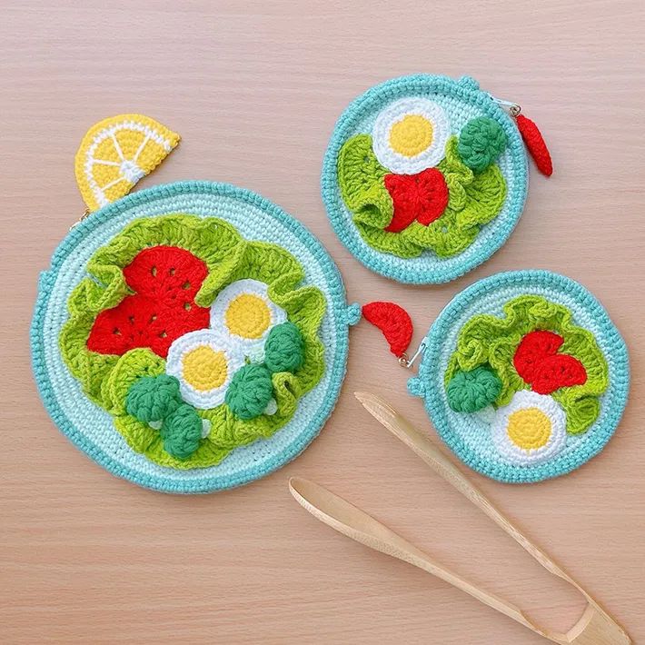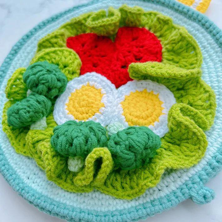 かぎ針網で作り出されたレタスやトマト、卵、ブロッコリーなどの食材がお皿に盛られている様子がかわいらしいです。