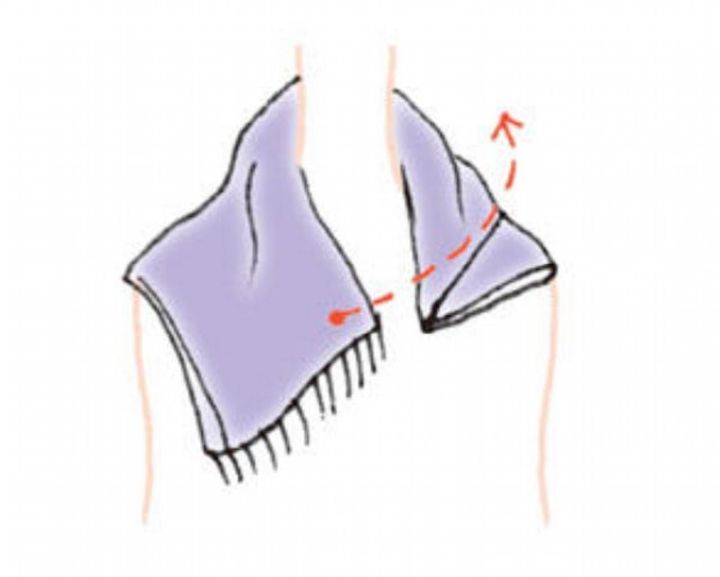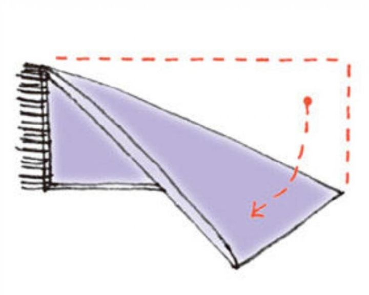 【1】ストールの長さを半分に折り、さらに対角線で折る。