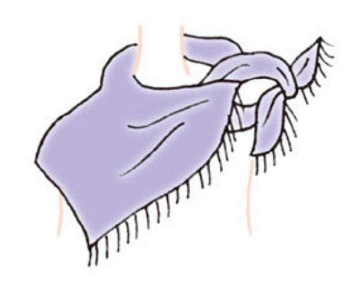 【2】ストールを肩にかけ、折り目の両端をサイドで固結びする。