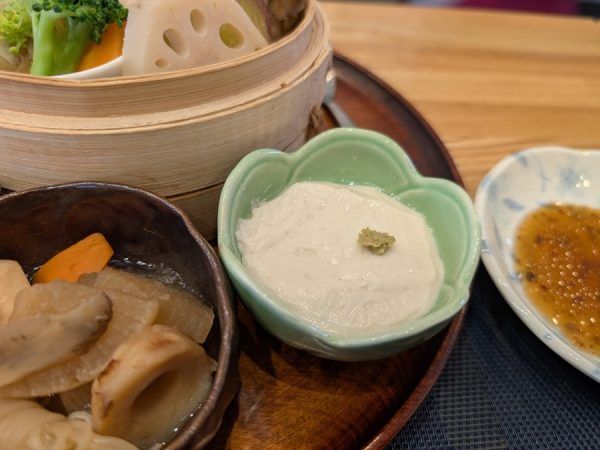 まずはお醤油、次にお塩、最後は黒蜜ときなこ。 特にお塩で食べる胡麻豆腐は新鮮で胡麻の味が引き立ってお気に入り♪ せいろの中にはたっぷりのお野菜に茶碗蒸しとたこやき。