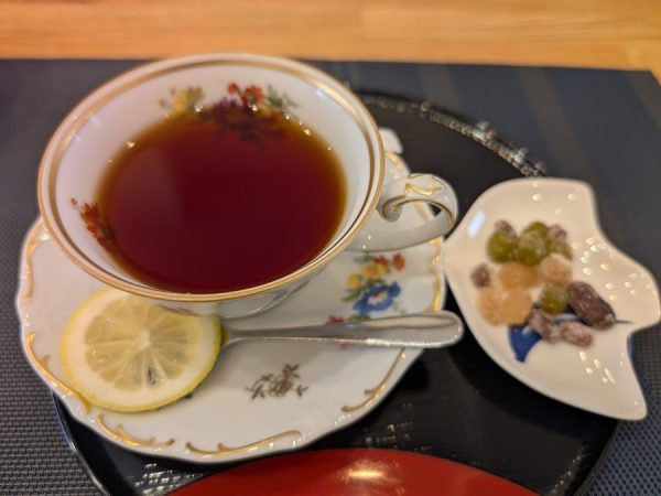 チョイスした紅茶には甘納豆が添えられた嬉しいサービス。 女将さんとの楽しい会話をしながらアフタードリンクを楽しむ時間は最高。 ゆったりとしたランチタイムを堪能できました。