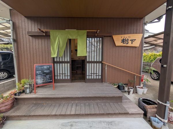 第52番札所でもある太山寺の一の門を目の前に左手、西方面に向かいます。 50mほど直進し最初の角を右に曲がるとお店があります。 一軒家を改装してお店にした「ごはんや樹下」さんは、まるで知る人ぞ知るお店。