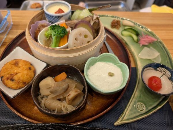 次に登場したのがせいろや小鉢がのったお盆。 そして色とりどりのお漬物がのった月の形のお皿。 なんと黒い平皿も月の形のお皿もお茶碗も女将さん手作り♪