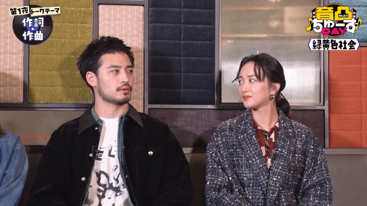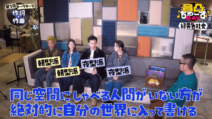 6つのトークテーマの中から、最初にキーボードのpeppeさんが“ちゅーず”したのは「作詞・作曲」。4人全員が、楽曲制作に携わる緑黄色社会。朝方だというpeppeさんは「起きてすぐスッキリした脳みそで書くことが多いです」と話します。同じく朝方のベース・穴見真吾さんは「日の出てる間に出たアイデアの方が後々、長く自分の中で面白味をもつ」そう。 一方、「丑三つ時ぐらいに」と話すのはヴォーカルの長屋晴子さん。「世間が寝静まった頃の方が自分と向き合える気がして」といいます。ギターの小林壱誓さんも「同じ空間にしゃべる人間がいない方が、絶対的に自分の世界に入って書けるので」とのこと。