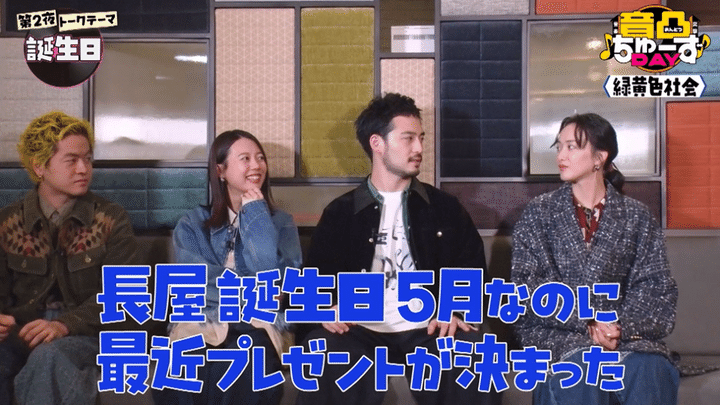 「バンド内でプレゼントの交換はあるのか?」と聞く下埜に、緑黄色社会の結成(2012年)以来「(全員分合わせたら)何十回も一緒に過ごしてるからね、お互いの誕生日を」(小林さん)、「そうだね、十回越えてる」(穴見さん)、「今まではそれぞれがプレゼントをあげてたんですよ。でも最近は本人が欲しい物をあげよう、になりました」(長屋さん)とメンバー。 下埜が「peppeさん欲しい物言いました?」と尋ねると、「まだ言ってないですね。長屋のは決めたもんね」と話すpeppeさん。あれ、長屋さんの誕生日って何月ですか…?