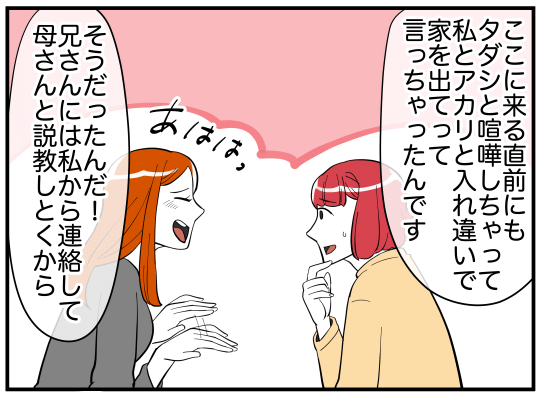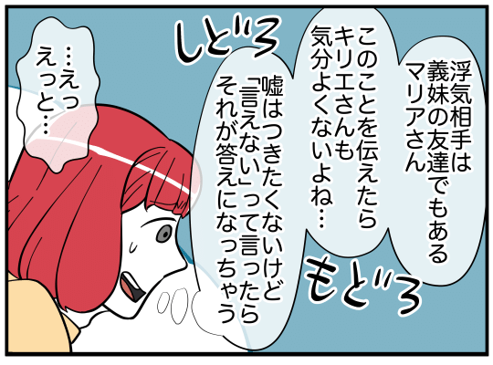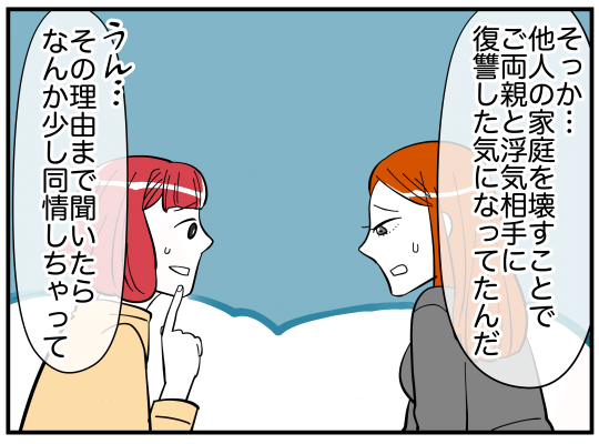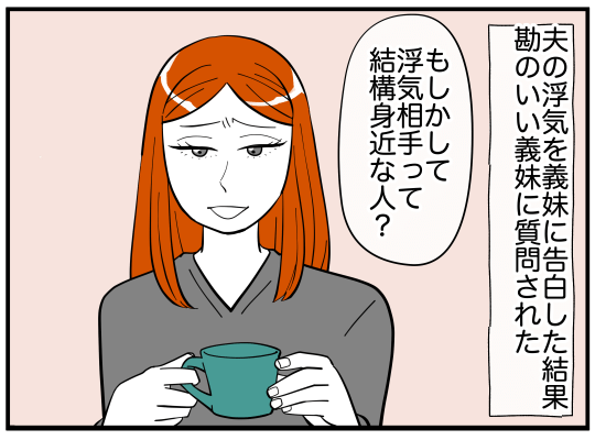 夫が不倫していたことを義妹に打ち明けた主人公。すると義妹は大憤慨。不貞を働いた兄を軽蔑し、自分と母が全面的に味方になると言ってくれた。そしてここまでの話から不倫相手の正体について言及する…