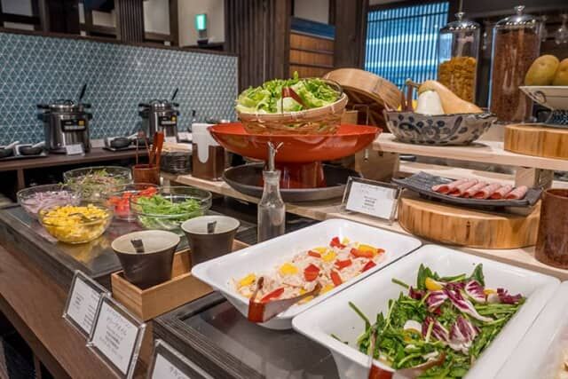 2025年9月にリニューアルしたホテル【HANARE by Tokyu Stay】の朝食は、5種類の和洋食からメインプレートを選ぶハーフビュッフェスタイル。京都の家庭料理 “おばんざい” をはじめ、冷菜や温かい料理、彩り豊かなフレッシュサラダ、フルーツなどを楽しめます。