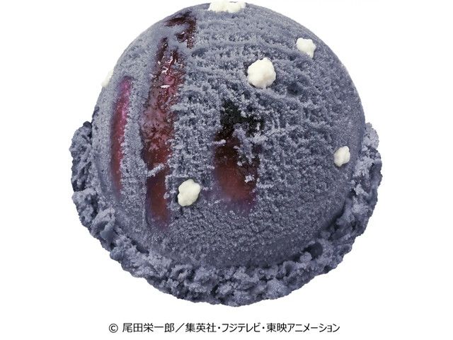 「ONE PIECE」でおなじみの悪魔の実“ゴムゴムの実”がアイスクリームに!? フルーツ風味シャーベットにソーダ風味リボンを合わせ、さらに白いパチパチキャンディが入ってまるでフルーツパンチを食べているよう!
