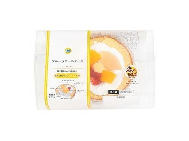 北海道産純生クリームとカスタードソース、白桃、マンゴー、苺ソースを巻いたロールケーキです。カスタードソースには「森のたまご」を使用しました。