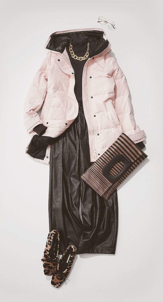 ピンクダウンコート¥242,000(カナダグース/カナダグースジャパン)ハイネックニット¥17,600(プランクプロジェクト/プランクプロジェクト 青山店)エコレザーパンツ¥39,600(サクラ/インターリブ)バッグ¥61,600(ゲラルディーニ/クイーポ)パンプス¥47,300(ピッピシック/ベイジュ)メガネ¥25,740(レイバン/ルックスオティカジャパン カスタマーサービス)チェーンネックレス¥46,640(ベン・アムン/ZUTTOHOLIC)