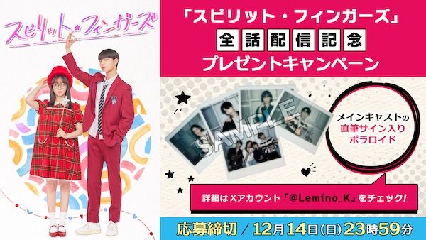 『スピリット・フィンガーズ』全話配信を記念して、Lemino韓流・アジア公式X(@Lemino_K)をフォローし、対象ポストをリポストいただいた方の中から、抽選でメインキャストの直筆サイン入りポラロイドが当たるプレゼントキャンペーンを実施中。応募期間や注意事項をご確認のうえ、ぜひ奮ってご参加ください。