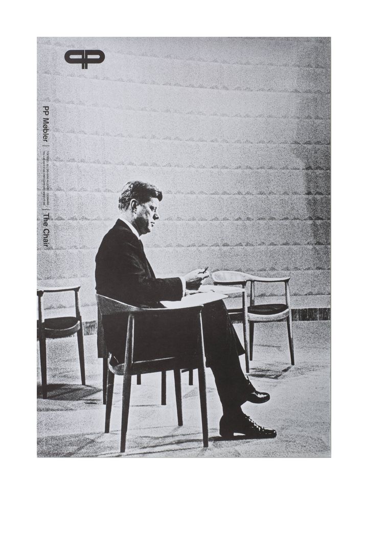<写真>1960年、アメリカ大統領選テレビ討論会で《ザ・チェア》にかけるジョン・F・ケネディの写真を後にPPモブラー社がポスターにした。《ザ・チェア PPモブラー社ポスター》織田コレクション
