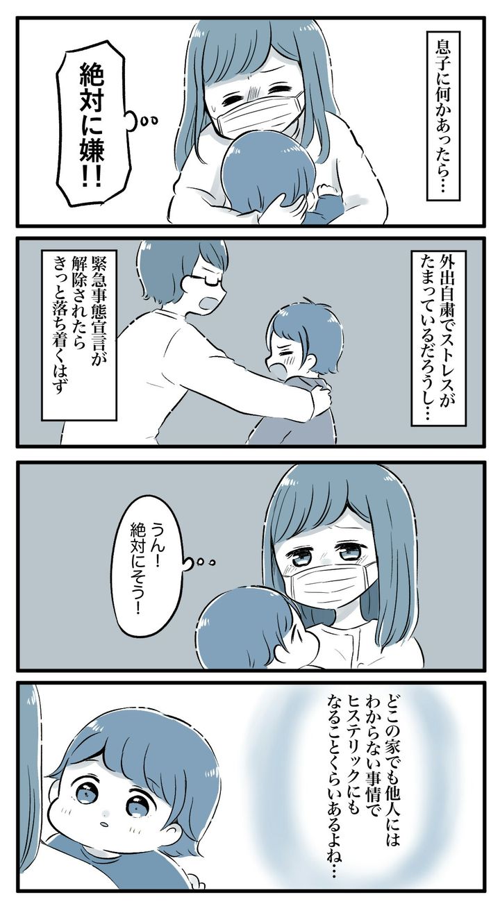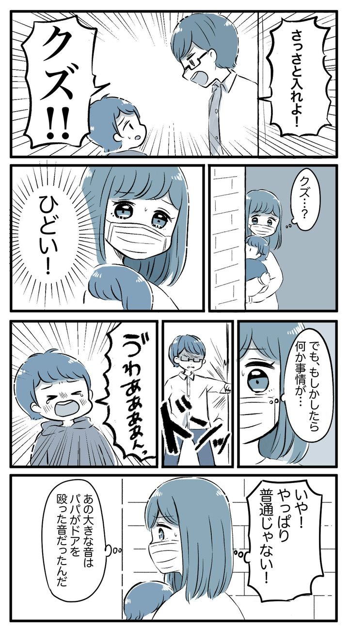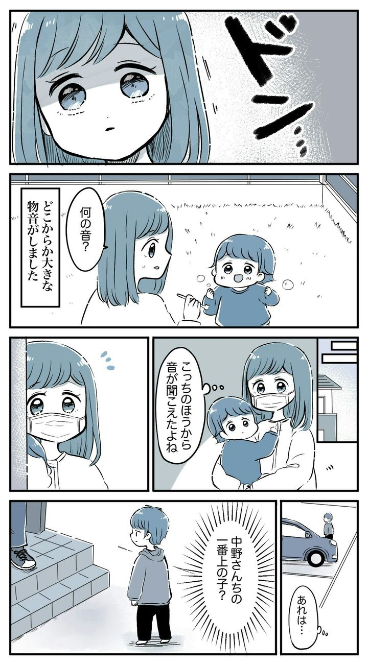 一見、仲が良さそうに見えていたご近所・中野家。コロナ禍に突入し、おうち時間が増えたころ、主人公は中野家の異変を感じ取ります。最初は、道端ですれ違ったとき、ママが子どもたちに向かって暴言を吐き捨てる場面に遭遇。このときは、「イライラしていただけ」と思い直し、そっと自分の胸にしまいます。