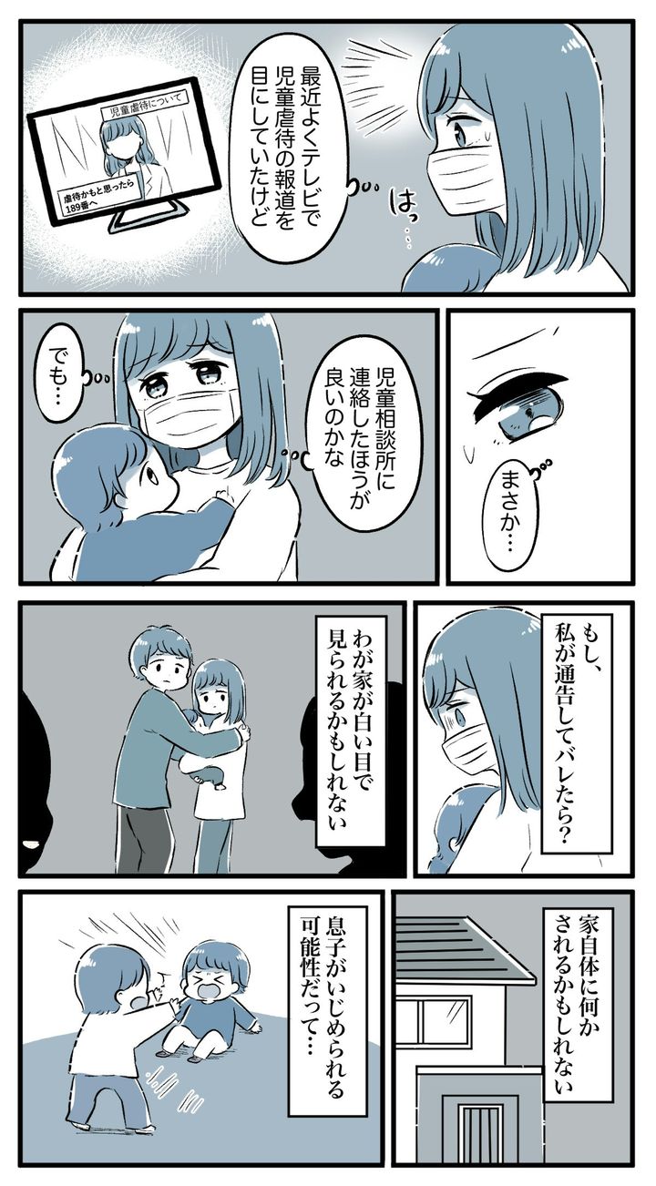 (この漫画は、とあるママによる体験談をもとにしたものです)住宅街に住む主人公は、近所の家族に異変を感じていました。仲むつまじいように見えた5人家族の中野家でしたが、ある日、大きな物音が聞こえてきました。主人公が見に行ってみると、険しい表情のパパと、怯える長男の姿が見えます。主人公は、児童相談所へ通告すべきかどうか迷います…。ですが、もしも勘違いだったら?通告したことがバレて、家族やわが子にもしものことが起きたら?児相へ通告することの難しさが描かれています。