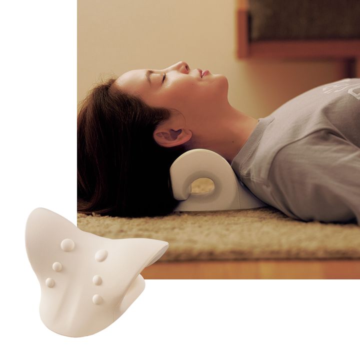 ストレートネックの原因となる胸鎖乳突筋や首・肩周りの筋肉のコリをほぐせる首ストレッチ用グッズ。ネックリラックスピロー ストレッチタイプ アイボリー ¥3,980/My Comfort
