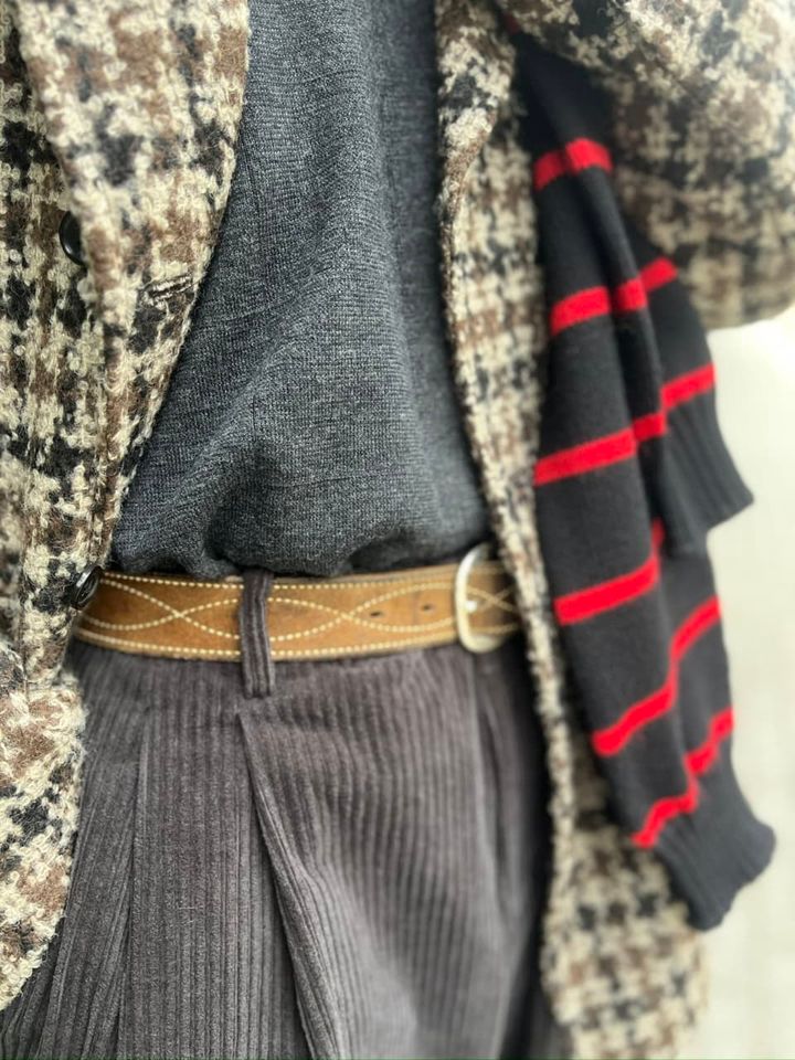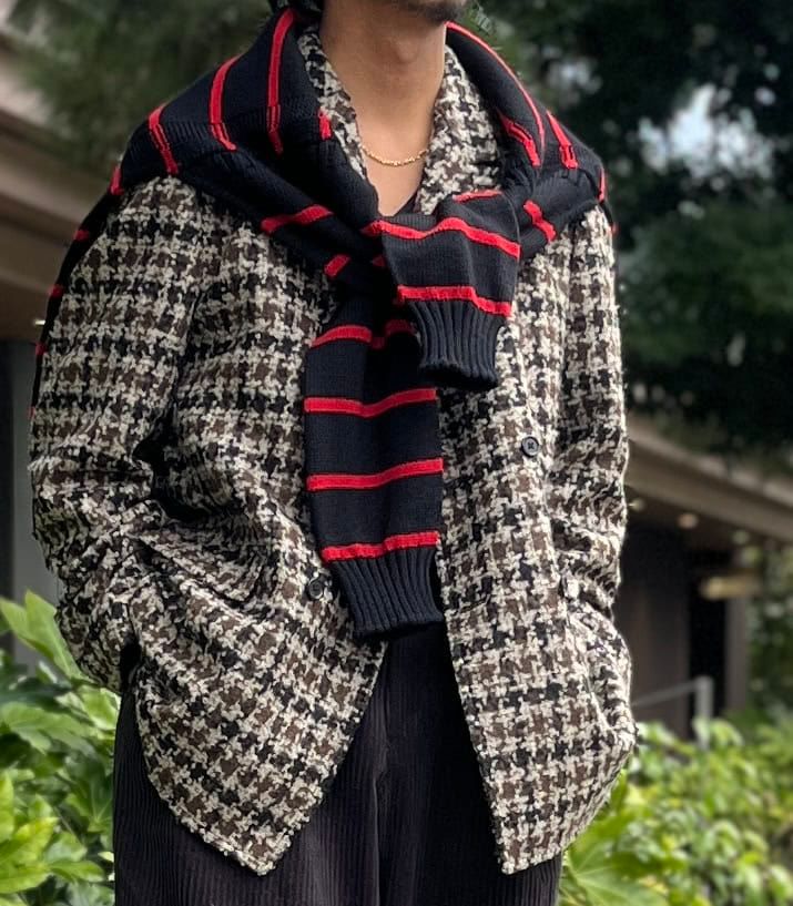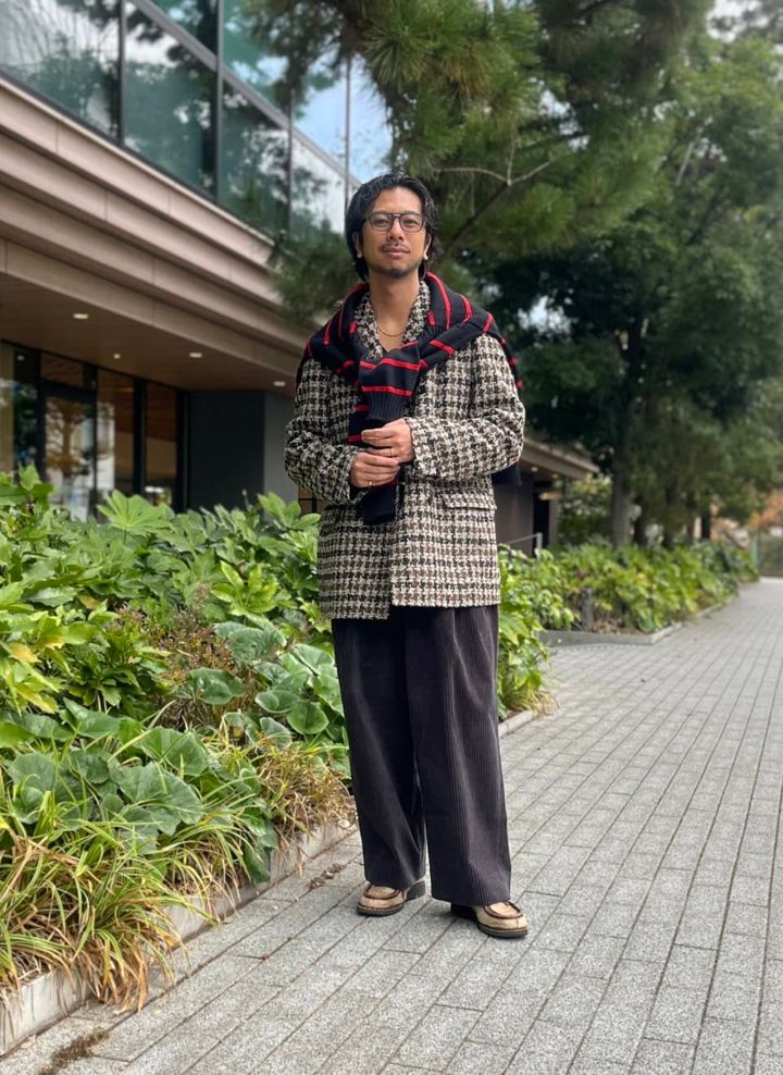 存在感あるツイードコートや太畝コーデュロイパンツなど、内田さんがセレクトしているのはかなりクセのあるアイテム。それなのにバランスよくまとまっているのは、コートの色を全て拾っているから。「色を拾うのが好きなタイプで、全てコートの色を拾ったアイテムで構成してみました。肩かけしたニットの赤だけ差し色として投入していますが、カラーリングに統一感を持たせることで、その差し色もより引き立つんです。。一見するとケンカしそうなアイテムも、どこかに整合性を持たせると意外といけちゃうんですよね」
