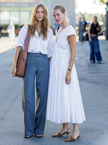 白シャツをハイウエストのパンツにタックインしたり、胸下で切り替えられたワンピースを選んだりと、ごく自然に腰の位置を高く見せるテクニックに注目。タイムレスなアイテムこそ、こうした一手間が洗練度を格段に引き上げる。