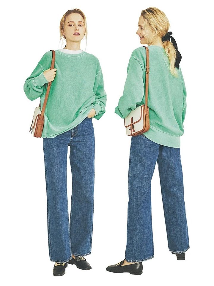 白TとスラックスのようなインディゴデニムにペールグリーンのスウェットをON。クラシカルな靴・バッグのセットでカジュアルをキレイめにシフト。