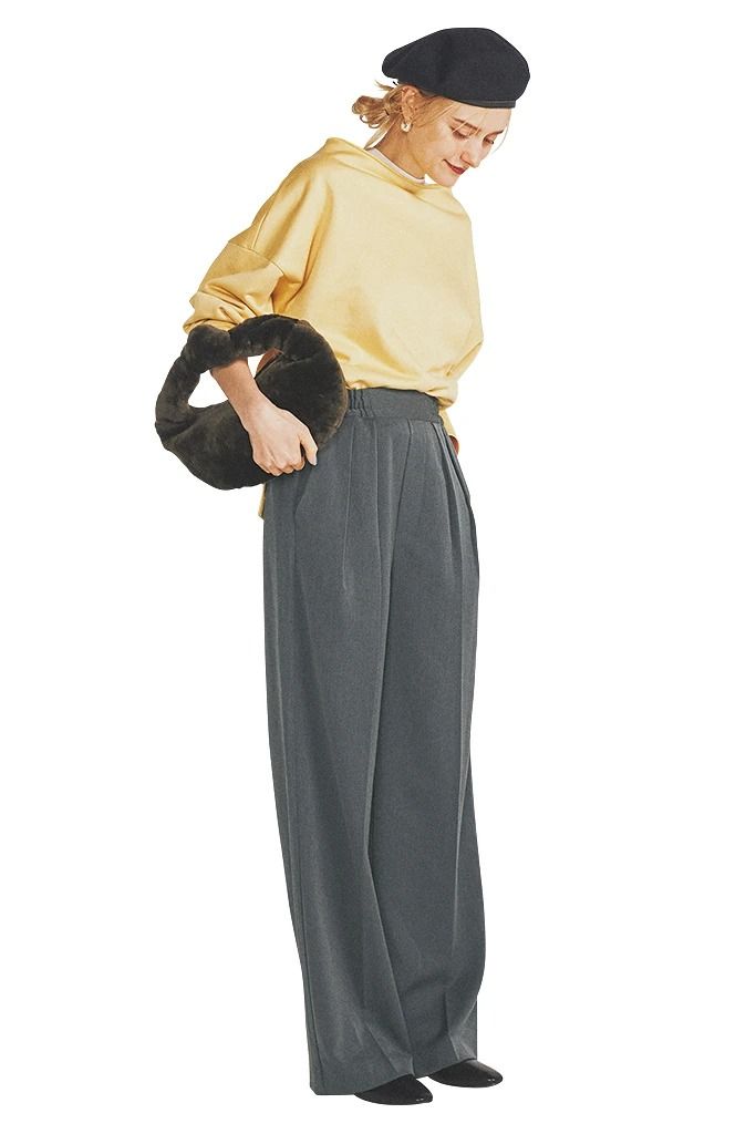 1つあると重宝するのがキレイな色との合わせも整う、チャコールグレーのボトム。お堅い色のイメージに反する、柔らかい素材でトップスの甘さをおさえつつ、リラックスした印象に。