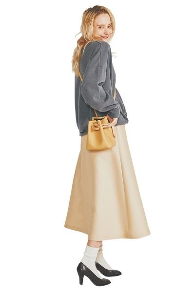 ハリのあるフレアスカートをつなげて、ヴィンテージライクなスウェットのイメージを刷新。くたっとしたゆとりあるシルエットのグレーが抜けとして作用し、ソックス&パンプスで足元まで女っぽくても「甘すぎ」には見えない。