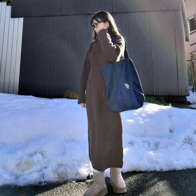 大人世代がショートムートンブーツを取り入れるときは、脚を出さないスタイリングがおすすめ。例えばゆったりめ&ロング丈のワンピースはボリュームがあるブーツと相性がよく、リラクシーなコーデが楽しめますよ。さらに足元の冷え対策にもうってつけです。