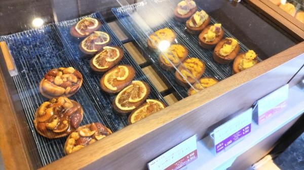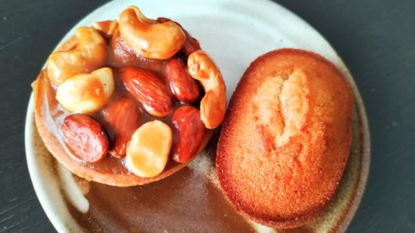 こちらはテイクアウトした焼き菓子。会員登録特典で頂いた、ベーシックな「レーヴ・ド・ブール」は外側が少しカリっとしていて、中はアーモンドが香るふわっとした生地。キャラメリゼされたナッツがたくさんのった「クロカント・ルーブル」(300円)も、おすすめです。