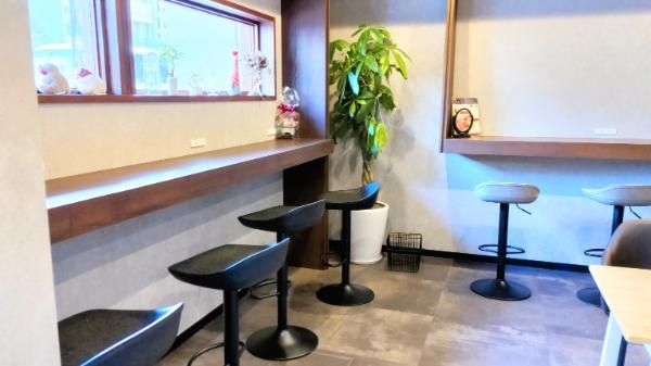 会員制のメリットは、①ポイント付与、②注文しなくても利用できるカフェスペース、③クーポン配布・イベント参加、④バースデーケーキがLINEから予約可能、といった点ですが、隠れ家を持ったような特別感が一番でしょうか。カフェスペースは、グレーを基調とした落ち着いた雰囲気で、2人掛けテーブルと4人掛けテーブルが一つずつと、カウンター席が8席あり、一人でも入りやすい雰囲気でした。Free Wi-Fiやコンセントがあるのも嬉しいですね。