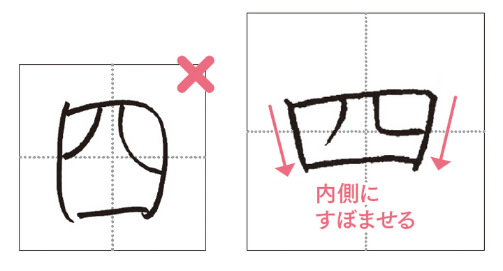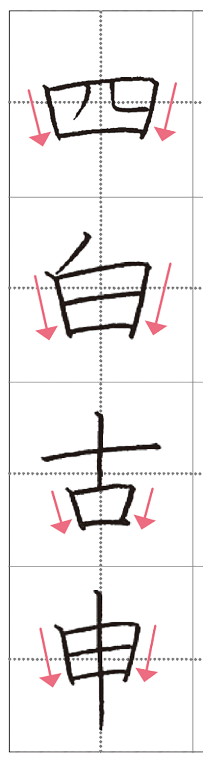 「四」「白」など「横長囲み」の漢字は、両側の線をまっすぐおろすと、間延びして見えます。この場合は、内側にすぼませるように書くのがコツ。