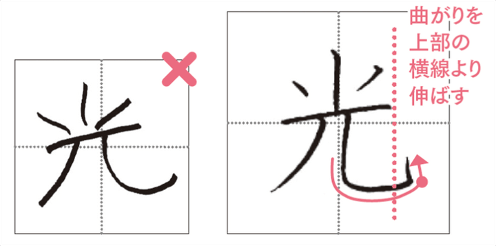 ここが角ばっていたり、短すぎたりすると、字形が整いません。