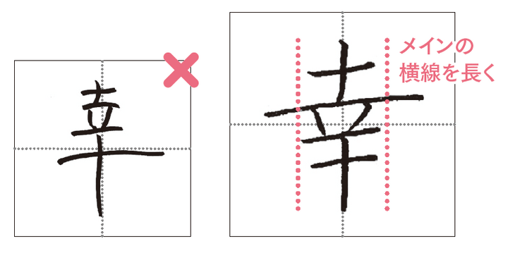 この線を長く伸ばして強調し、ほかの横線は短めに書くと、バランスが整った美しい文字に。